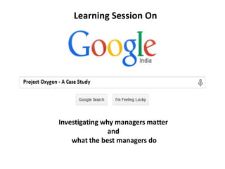 The document discusses Google's findings on the importance of effective management, highlighting research that shows a clear link between high-scoring managers and employee happiness, as well as reduced turnover. It outlines key behaviors of successful managers and addresses common pitfalls, emphasizing the value of training and assessments for managerial improvement. By November 2012, Google reported significant enhancements in managerial effectiveness, particularly among those who initially scored low, validating the assertion that good managers are essential for employee success.
