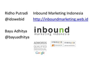 This document summarizes Google Analytics, Google Webmaster Tools, and Google Website Optimizer. It discusses how these tools can help measure website usage, track goals and events, understand traffic sources, and optimize websites to improve performance. Key information provided includes setting up analytics tracking, tagging links, setting up conversion goals, and using Google Webmaster Tools to submit sitemaps and check for indexing errors.