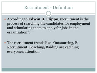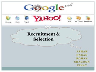 The document discusses recruitment policies and strategies at Yahoo and Google. It describes Yahoo's challenges in recruiting for its large global operations and diverse roles. Yahoo sources candidates through various means and evaluates technical candidates through written tests and interviews. The document also outlines Google's aggressive non-discrimination policies, its emphasis on innovation and flexibility for employees, and its large recruiting budget. It notes some perceived weaknesses in Google's recruitment system around performance metrics, speed, and focus on youth.