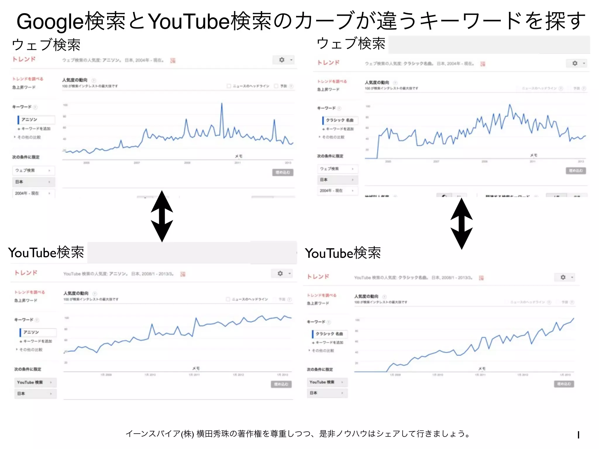 http://www.google.com/trends/ http://thenextweb.com/google/2013/03/20/google-trends-gains- youtube-search-data-going-back-to-2008-lets-you-limit-results- to-just-videos/ 新たにYouTubeでの キーワード検索数 の推移を調べられ るようになった。 イーンスパイア(株) 横田秀珠の著作権を尊重しつつ、是非ノウハウはシェアして行きましょう。 2