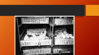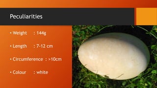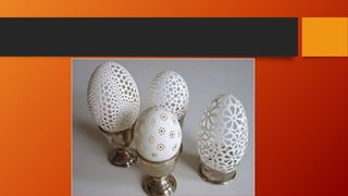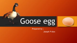 This document summarizes the physical and chemical properties of goose eggs. Goose eggs weigh 144g on average, with a white (albumen) weighing 71.5g, a yolk weighing 54g, and a shell weighing 18.5g. The yolk contains 46.1% water, 16.7% protein, and 33% fat, while the white contains 87.1% water and 10.8% protein. Goose eggs contain 266 calories, 19g fat, and 1227mg cholesterol per 144g. They provide more vitamin A, calcium, and iron than chicken eggs. Goose eggs can be incubated naturally by geese, hens, or Muscovy ducks, or artificially
