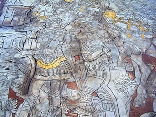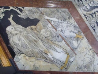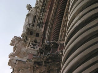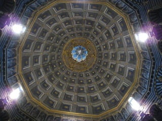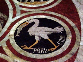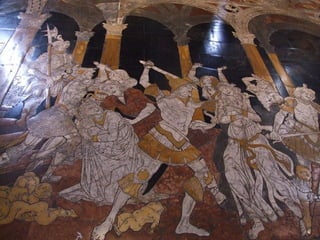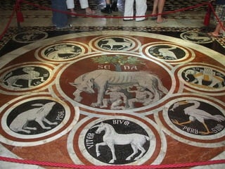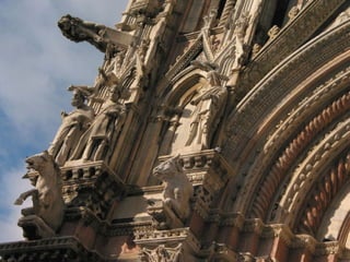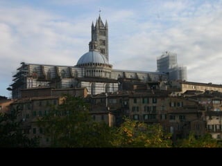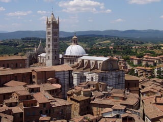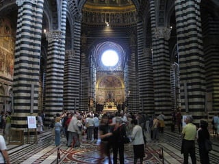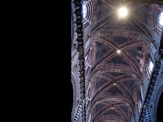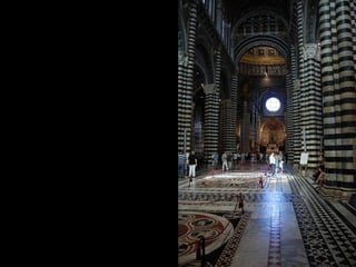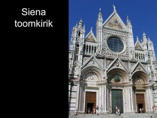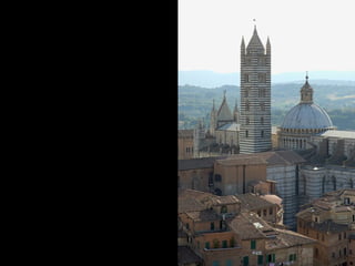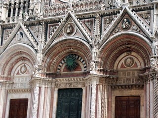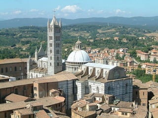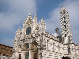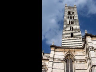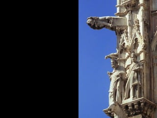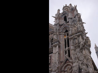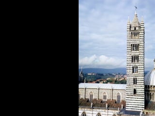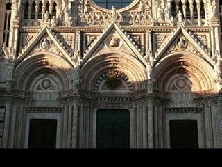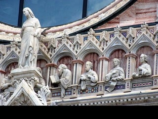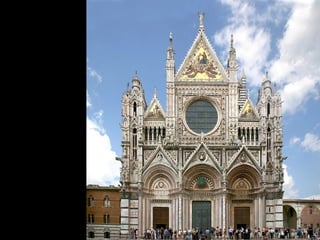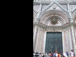 The document describes the façade of Siena Cathedral. It was built in two stages, with the lower part begun in 1284 in Tuscan Gothic style. Giovanni Pisano worked on this until 1296. The upper part was resumed in 1376 under a new design inspired by Orvieto Cathedral. It features statues by Giovanni Pisano and others of prophets and apostles, though most are copies with the originals kept elsewhere. The central door dates to 1958 while the mosaics on the gables were made in Venice in 1878.