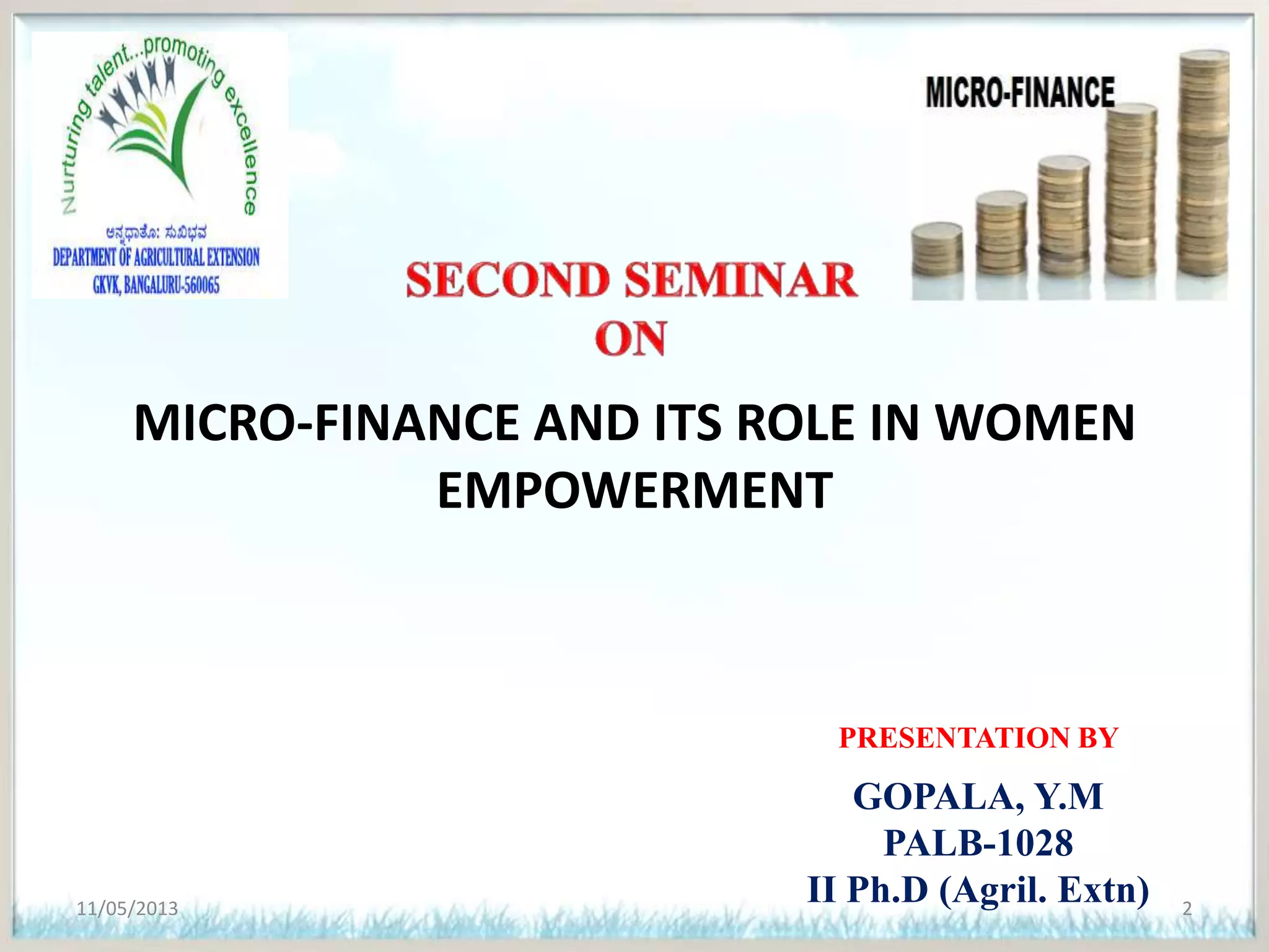 This document summarizes a presentation on microfinance and its role in women's empowerment. The presentation covered: