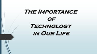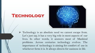 Technology plays an important role in many aspects of modern life. It helps answer many of humanity's problems and aims to make things more convenient over time. Technology such as computers, the internet, cell phones, tablets, and calculators help speed up the learning process for students and make communication, research, and schoolwork more efficient. Electricity is also an essential part of modern life that powers appliances, lighting, fans, and more, and has become integrated into many daily tasks and devices used for work, school, and personal use.
