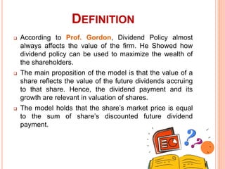Gordon's model posits that a firm's dividend policy impacts its value and that share price reflects the present value of future dividends. The model assumes conditions such as a constant internal rate of return and a perpetual earnings stream, with the market price derived from future dividend payouts. The researcher concluded that the model was disproven for both Bajaj Steel and Tata Consultancy Services across the analyzed years.