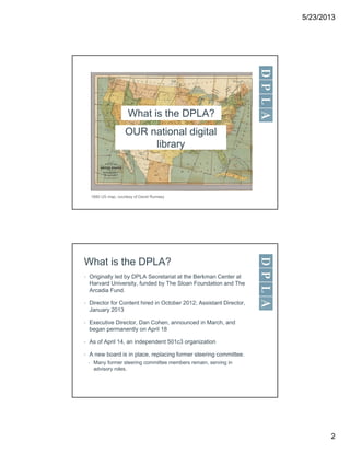 The document outlines the Digital Public Library of America (DPLA), a national digital library that aggregates content from various cultural heritage institutions. It describes the DPLA's board, code, metadata practices, content from over 450 institutions, tools and services, community involvement, and pilot with service and content hubs to harvest metadata and content. The DPLA aims to provide open access to digitized materials from across the United States through its portal and API.