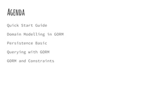 This document provides an overview of Object Relational Mapping (ORM) using GORM in Grails. It discusses how GORM uses Hibernate under the hood and provides examples of basic CRUD operations and associations like one-to-many and many-to-many relationships. It also covers querying with GORM using dynamic finders, where queries, criteria, HQL and advanced features like events and custom mappings.