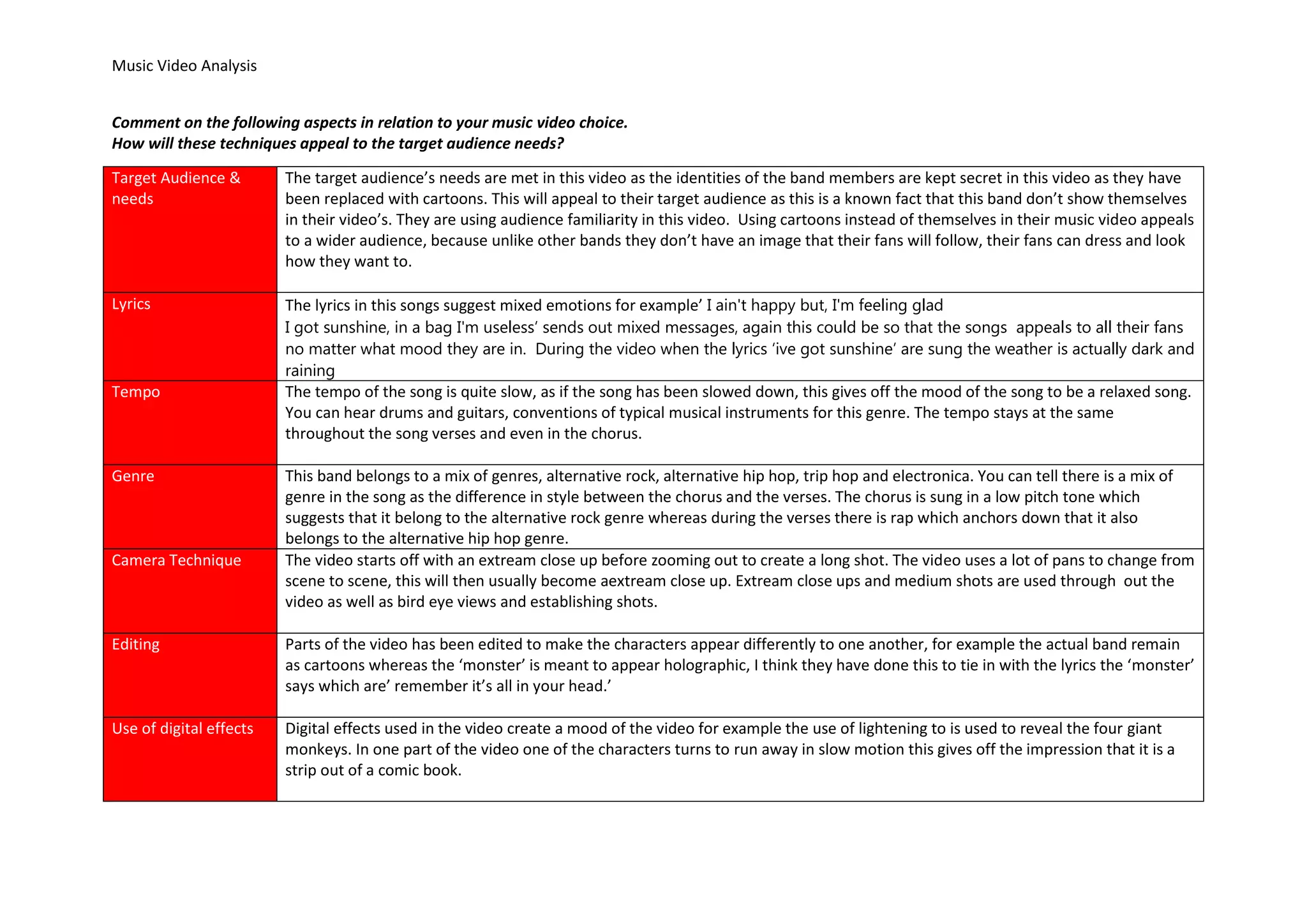 The target audience for this music video is met through keeping the band members' identities secret by replacing them with cartoons. This appeals to their target audience as the band does not typically show themselves in videos. Using cartoons allows for a wider audience as fans can dress and look how they want without following a particular image.