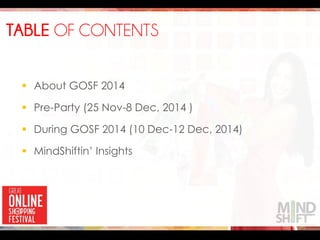 GOSF 2014, the third iteration of Google's annual online shopping festival, took place from December 10-12, 2014, featuring over 450 ecommerce sites and numerous deals. The pre-party events from November 25 to December 8 encouraged brand engagement through contests, resulting in increased social media buzz and participation. The event witnessed a significant increase in traffic and sales compared to previous years, with a noted preference for mobile shopping and a positive overall sentiment among participants.