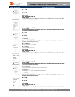The document provides details on various publications related to GOST certification, including volumes on Orthodox churches and architectural concepts, available in multiple languages in electronic format. Each publication is available for ordering through a specified website, and pricing information can be obtained by contacting the seller. Additionally, there are references to compliance and regulatory catalogs available for order.