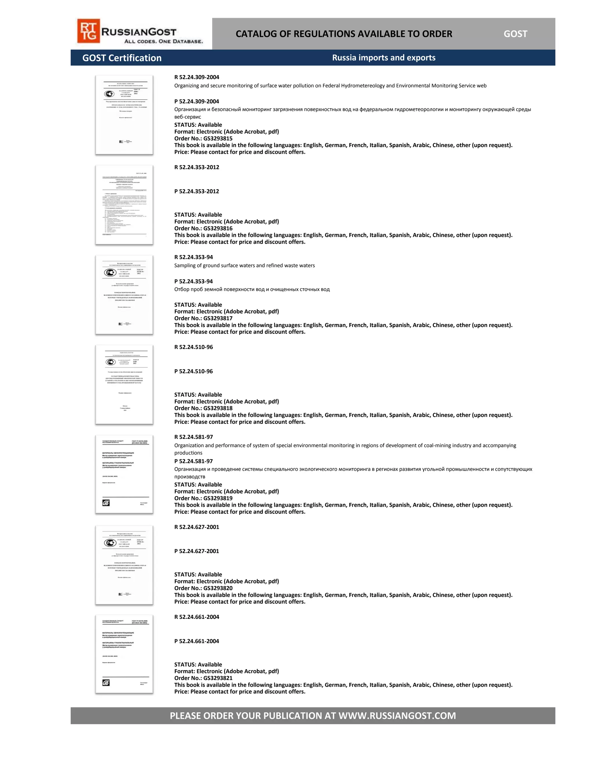 This document provides information on several GOST certifications for books on environmental monitoring and water sampling. It lists the certification number, title in English and Russian, format, order number, languages available, and indicates that the price can be obtained by contacting the seller. All of the certifications listed are for electronic PDF versions of the books and their status is shown as available.