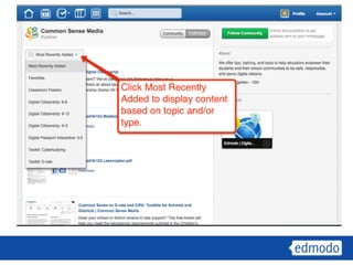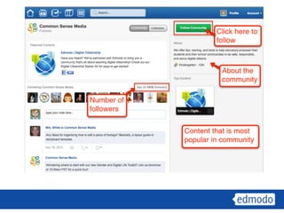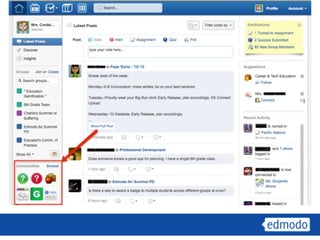 The document provides instructions on logging into Edmodo and joining a specific group for teachers to enhance their social media skills in the classroom. It outlines objectives for teachers to use Edmodo for professional growth, set up student groups, and participate in digital learning communities. Additionally, it emphasizes sharing experiences, resources, and ideas among educators to improve teaching efficacy.
