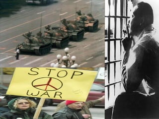 This document discusses different models of government and civil disobedience from a Christian perspective. It analyzes secularism, reconstructionism, and Jeffersonianism as models of government/church interaction, and notes Jeffersonianism allows freedom for all religions while recognizing a natural divine law. Regarding civil disobedience, it rejects anarchism and radical patriotism in favor of biblical submissionism. This holds Christians can peacefully disobey governments that command evil but should otherwise obey just laws, work to change governments, accept consequences, and pray for leaders.