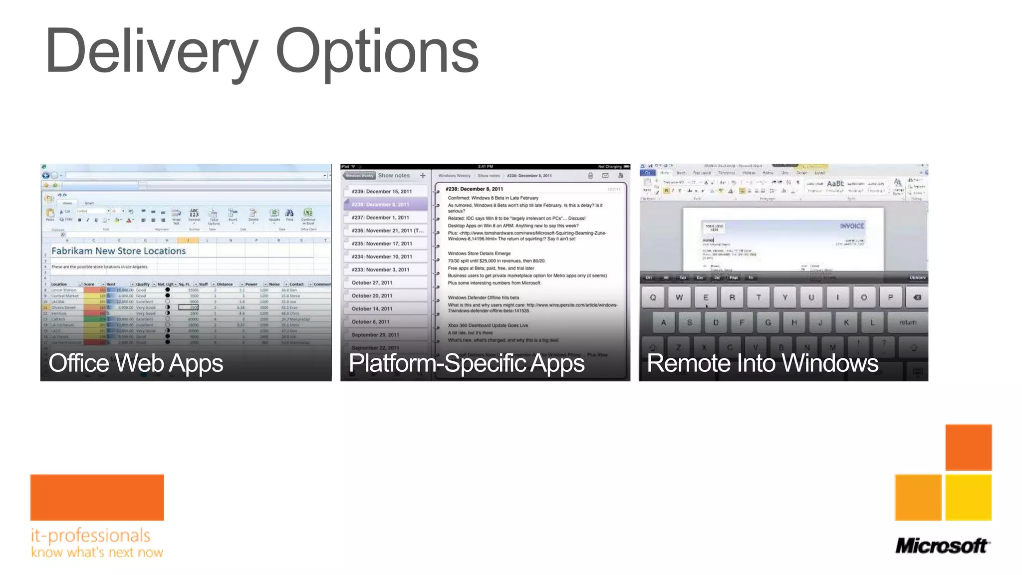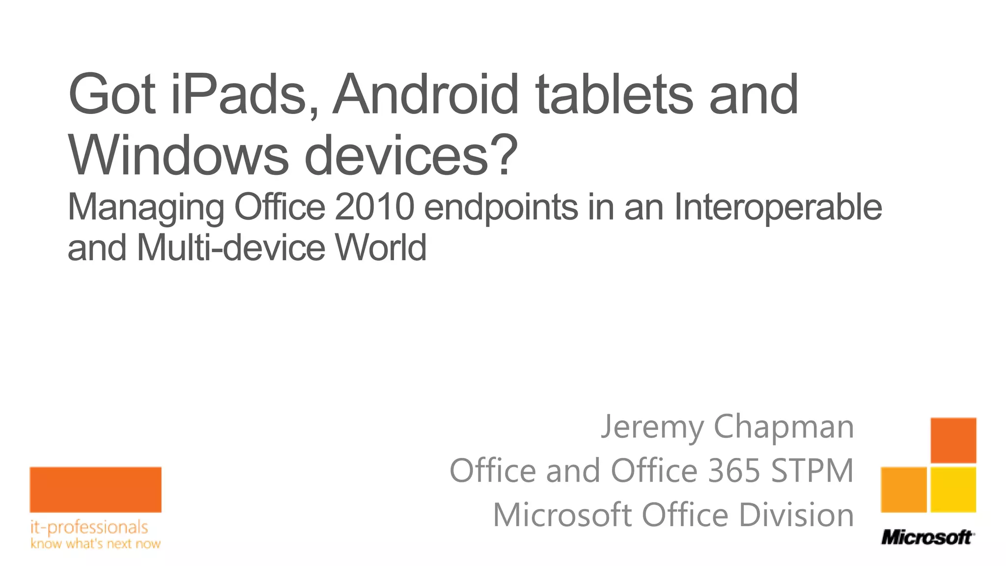 Jeremy Chapman discusses strengths and weaknesses of various approaches to providing access to Office applications and files from different devices. Remote access options like Office Web Apps and platform-specific apps allow access from any device but with less functionality. Locally installed options have full functionality but require managed, trusted devices. Identity-based protection and rights management can help secure access and limit data sharing based on device trust levels. There is no single best solution, and security involves balancing access with manageability.