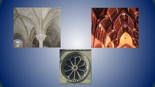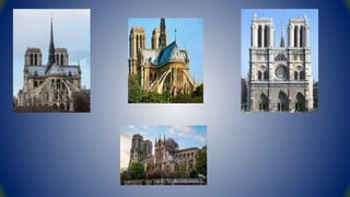 Early Gothic architecture originated in Western Europe and used different building materials depending on location, such as bricks in Germany and stone in France. Key characteristics included pointed arches, flying buttresses, high pinnacles, and stained glass windows. Gothic cathedrals like Notre-Dame in Paris featured tall naves supported by flying buttresses, with pointed arches, rib vaults, rose windows, and ornate sculptures.