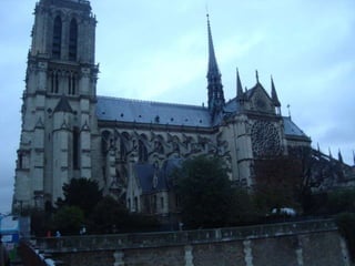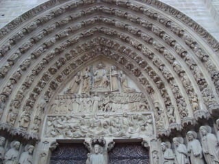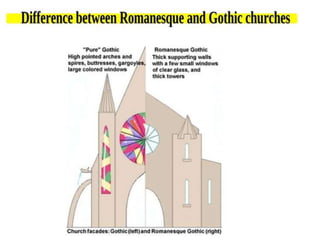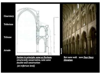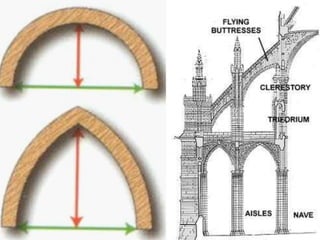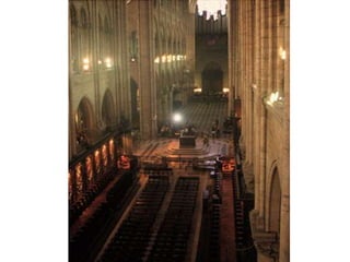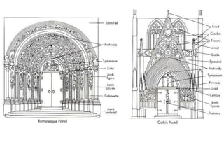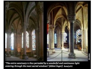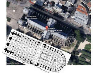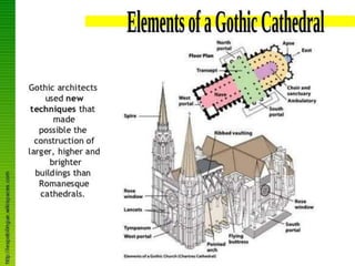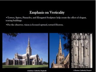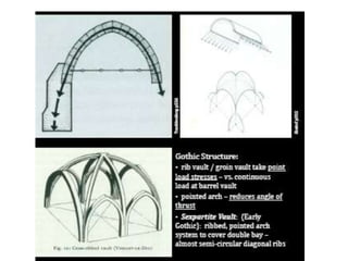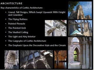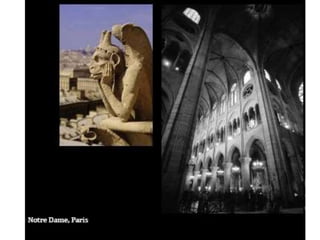This document provides an overview of Gothic architecture through a lecture on the subject. It discusses key characteristics of Gothic architecture like skeletal stone structures, the importance of light and visual arts, and cathedrals serving as images of heaven. Techniques introduced in Gothic architecture are explained, such as rib vaulting, flying buttresses, stained glass windows, and elaborate carvings. Specific examples of Gothic cathedrals are examined in detail, including Notre Dame Cathedral in Paris and its various architectural features.