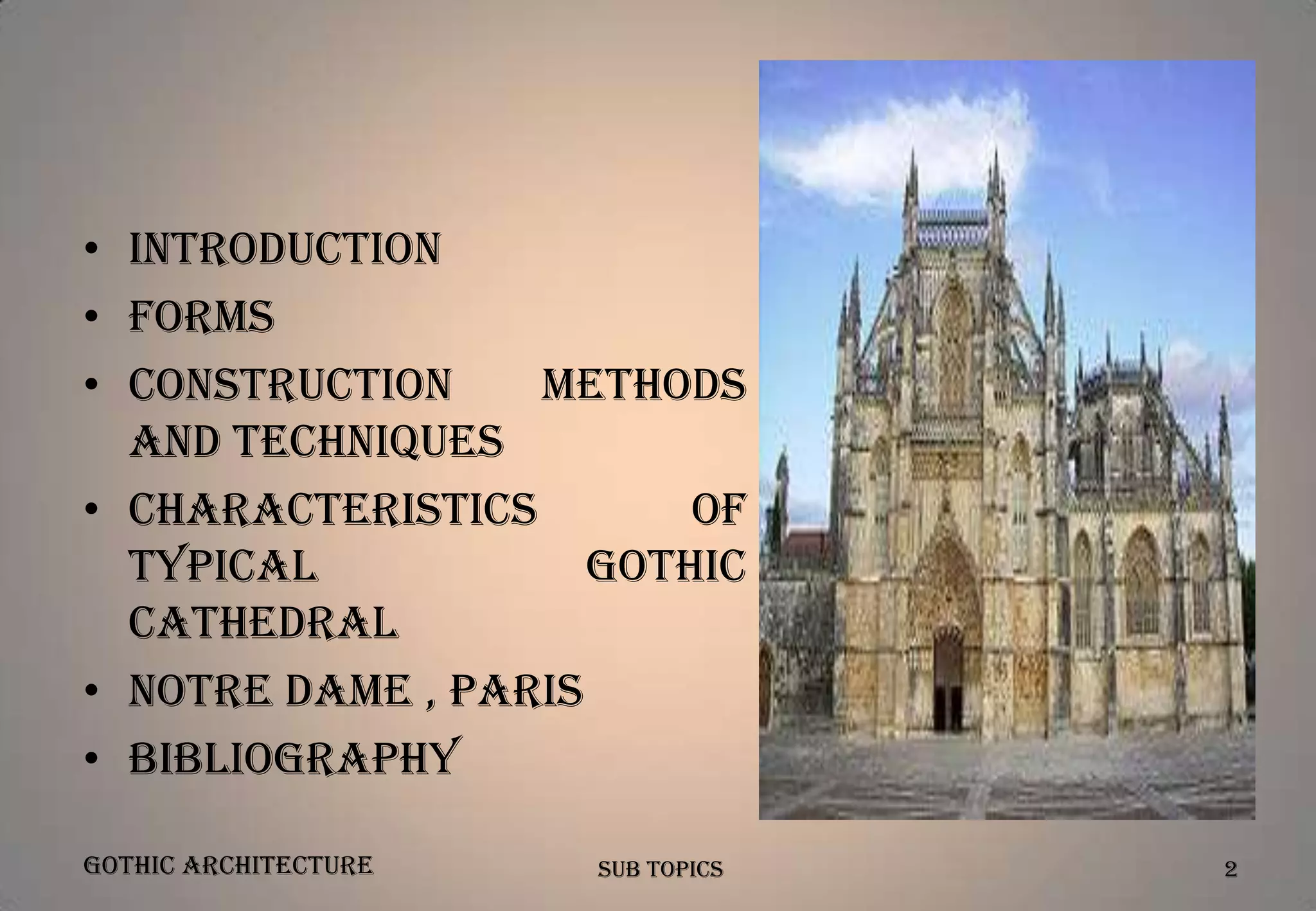 The document provides an overview of Gothic architecture through 3 paragraphs. It discusses that Gothic architecture flourished from the 12th to 16th centuries in Europe, featuring pointed arches, ribbed vaults, and flying buttresses. It was most prominently used in the construction of cathedrals and churches. The document then summarizes some key characteristics of Gothic cathedrals, including their Latin cross floor plan, pointed arches, stained glass windows, and vertical emphasis conveyed through buttresses, tracery, and towers/spires. It concludes by briefly mentioning Notre Dame Cathedral in Paris as an iconic example of Gothic architecture.