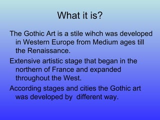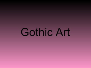Gothic art developed in Western Europe from the Middle Ages through the Renaissance. Some key aspects include elaborate cathedrals built starting in northern France using flying buttresses and stained glass windows to let in maximum light. Gothic architecture was characterized by pointed arches and vaulted ceilings in cathedrals, while Gothic sculpture moved towards more naturalism and realistic figures. Gothic painting included frescoes, stained glass windows, illuminated manuscripts, and later oil paintings on canvas as artistic styles evolved over centuries.