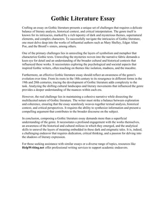 This document discusses the complexities and challenges of writing essays on gothic literature, highlighting the need for literary analysis, historical context, and critical interpretation of works by authors like Mary Shelley and Edgar Allan Poe. It emphasizes the importance of understanding the genre's evolution and maintaining coherence while navigating its intricate themes and symbols. Additionally, it touches on various other topics including decision-making processes, counterterrorism measures in Kenya, the significance of fuzzy logic in technology, and the narrative techniques in literature.