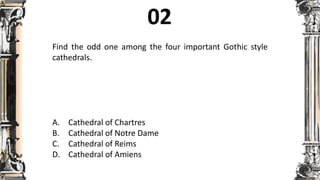 The document contains multiple choice questions about Gothic and Romanesque architecture. Gandhiji was referring to the grandeur of Gothic cathedrals like Notre Dame Cathedral in Paris. Romanesque architecture developed in the 11th-12th centuries and was characterized by thick walls, round arches and heavy, solid appearances. It served as a stepping stone to Gothic architecture, which had innovations like pointed arches, ribbed vaults and flying buttresses that allowed for larger windows and a sense of verticality.