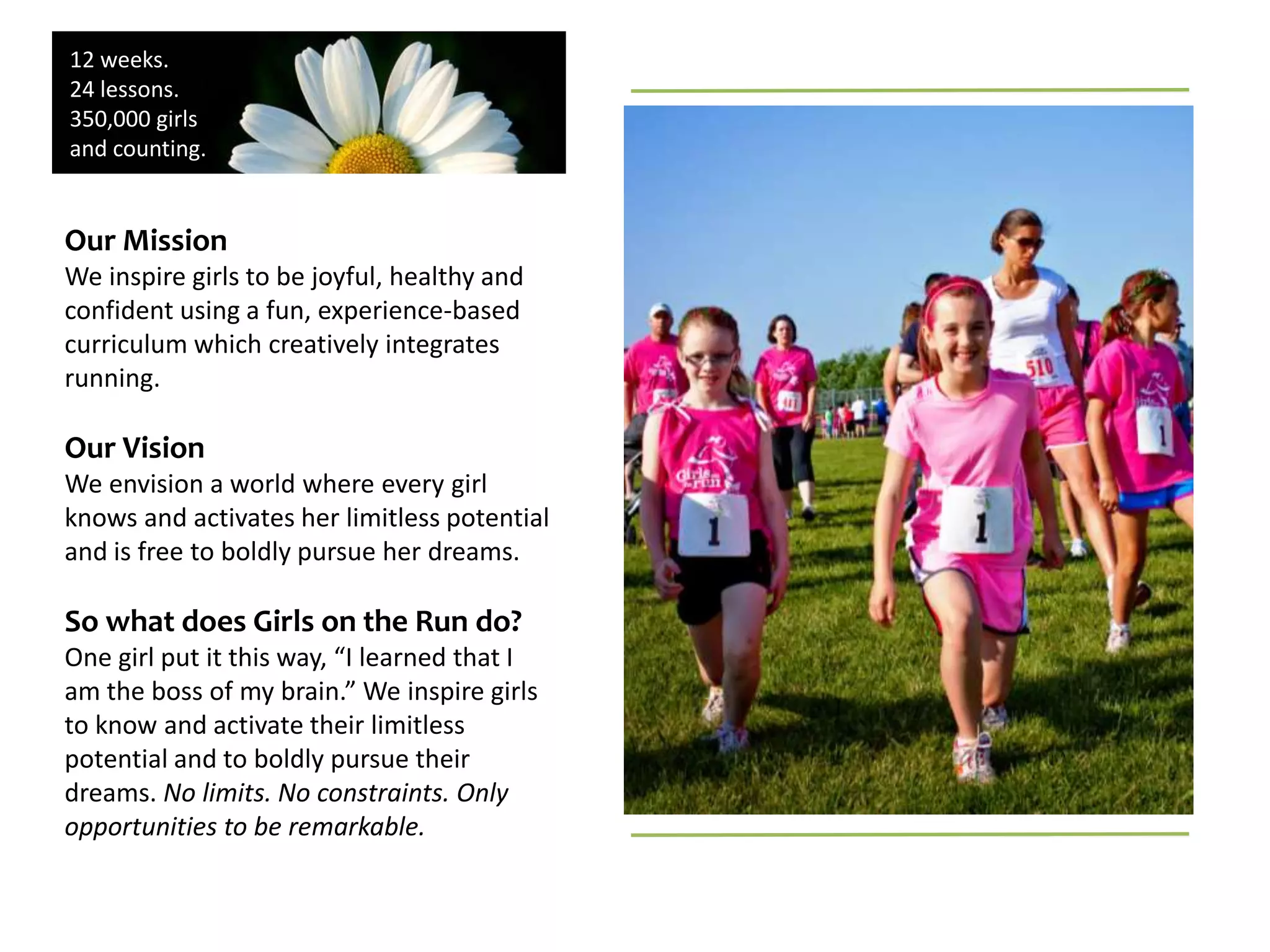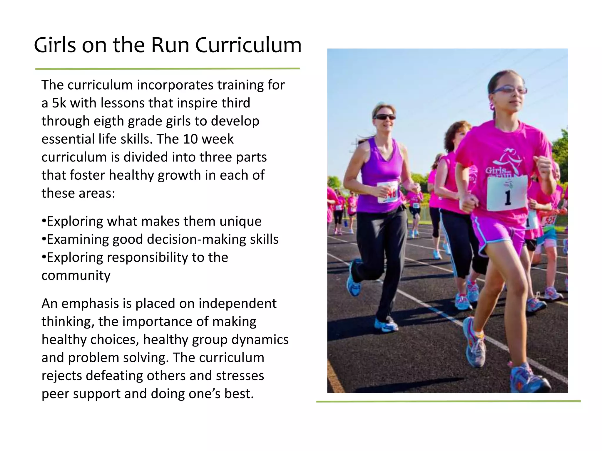The Girls on the Run curriculum is a 10-week program for 3rd through 8th grade girls that incorporates training for a 5k run while teaching life skills. The curriculum is divided into three parts focusing on uniqueness, decision-making, and community responsibility. It emphasizes independent thinking, healthy choices, group dynamics, and problem solving rather than competition. The program began in 2007 with 23 girls and has since grown to serve over 350,000 girls annually across 24 lessons and 12 weeks with over 500 volunteers.