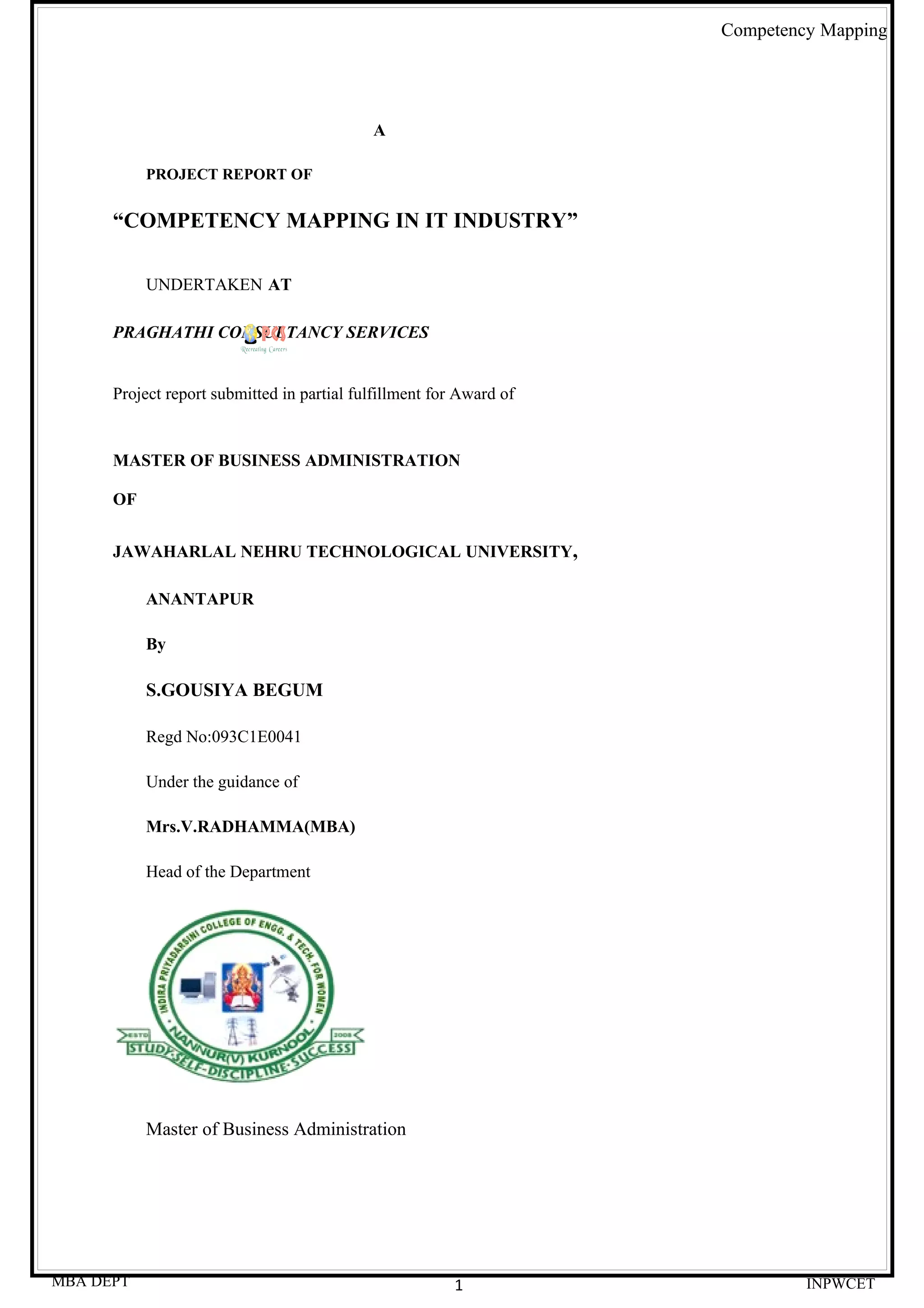 The document discusses competency mapping in the IT industry. It provides an overview of competency mapping and defines technical and behavioral competencies. It then describes the functional competencies required for various human resource development roles like recruitment, promotion, performance appraisal, etc. The objectives of the study are to identify competencies for different job levels or bands in an organization. The scope involves mapping competencies for multiple bands in an IT consulting practice. The study aims to help the organization identify the right fit between jobs and employees.