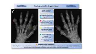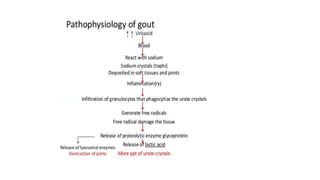 Gout is a chronic disorder of urate metabolism that causes recurrent attacks of inflammatory arthritis. It is most common in men over 40 years of age. Risk factors include purine-rich foods, alcohol, caffeine, trauma, and certain genetic mutations. An acute gout attack causes sudden severe pain, swelling, and tenderness in joints like the toe. Chronic gout results in deposits of urate crystals that form chalk-like tophi under the skin. Treatment involves medications to prevent attacks like NSAIDs, colchicine, allopurinol, and febuxostat or uricosurics. Surgery may be needed in advanced cases with joint destruction.
