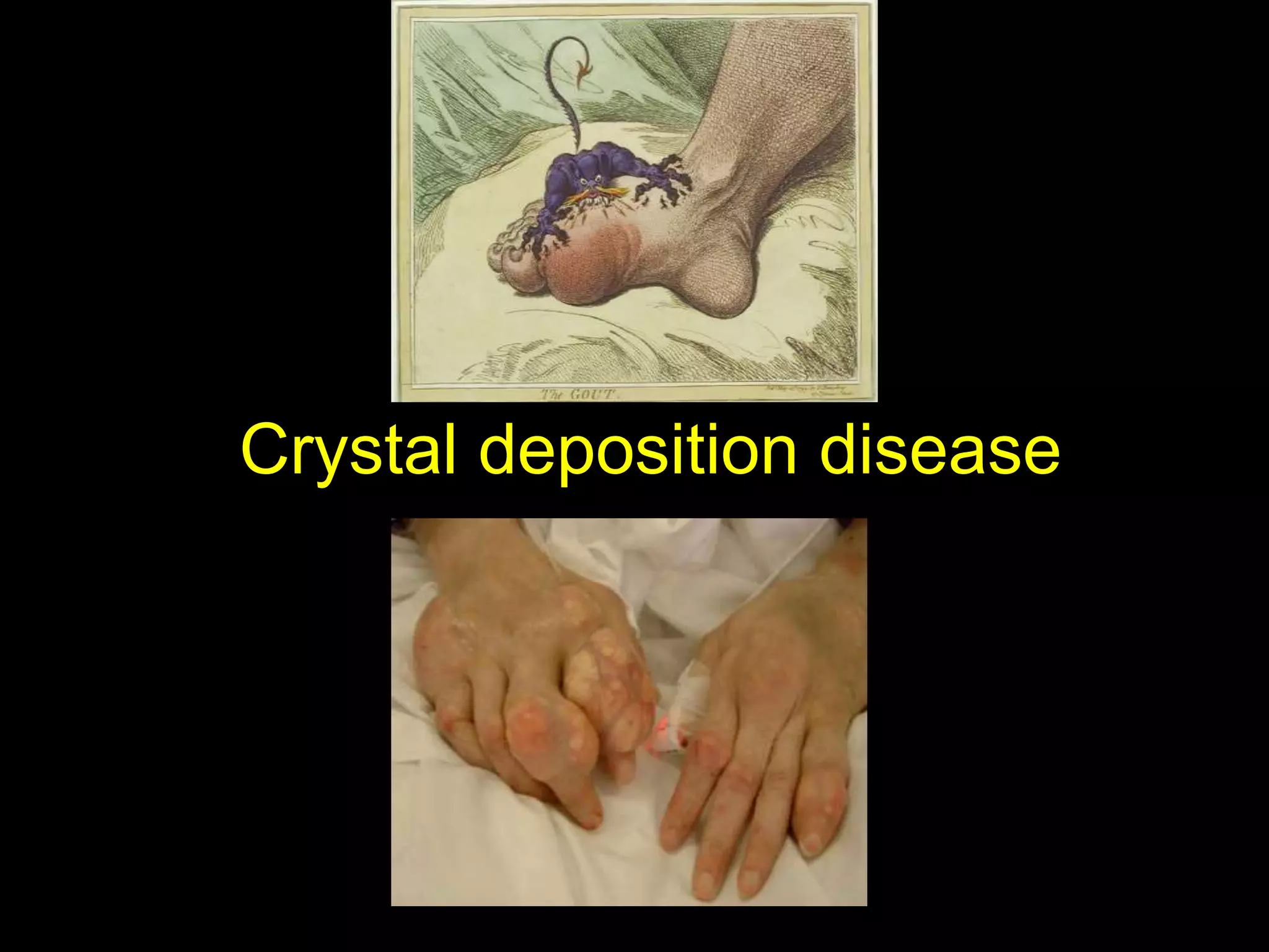 Crystal deposition diseases like gout result from the deposition of crystals like urate in joints and surrounding tissues. Gout is caused by elevated uric acid levels resulting from purine metabolism abnormalities. It usually affects middle-aged males and post-menopausal females, causing sudden, severe joint pain and inflammation. Diagnosis is confirmed by identifying urate crystals in joint fluid. Treatment involves lifestyle changes, medications like allopurinol and NSAIDs to prevent attacks and reduce uric acid levels.