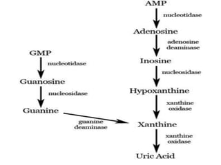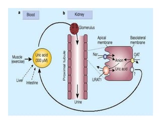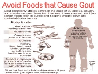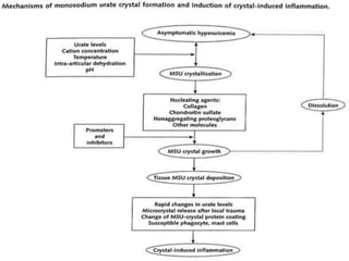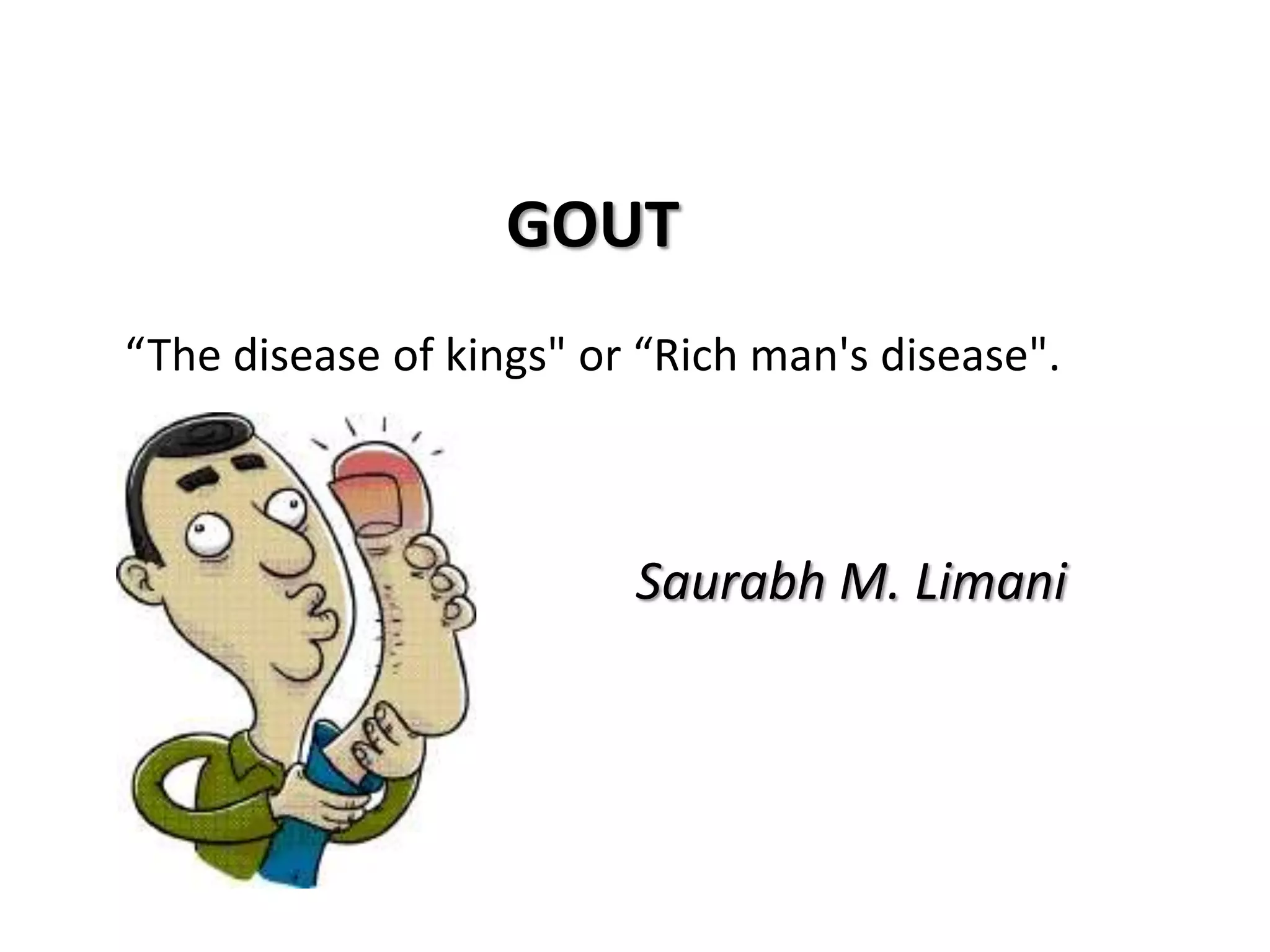 Gout is a disorder caused by elevated levels of uric acid in the blood that can lead to painful inflammation in joints. It most commonly affects the big toe. It is caused by either overproduction or underexcretion of uric acid by the kidneys, leading to uric acid crystal formation in joints. Risk factors include diet high in purines, obesity, genetics, and certain medical conditions. Treatment focuses on controlling uric acid levels through medications and dietary changes like limiting purine-rich foods and alcohol.