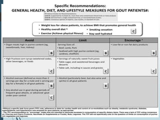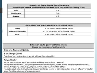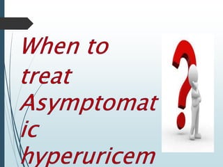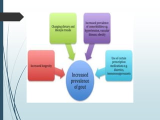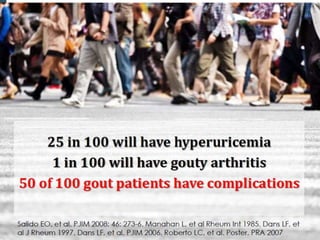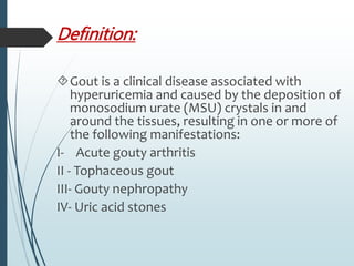 Gout is a clinical disease caused by the deposition of monosodium urate crystals in tissues, which can cause acute gouty arthritis, tophaceous gout, gouty nephropathy, or uric acid stones. The aims of gout treatment are to improve outcomes by suppressing flares, eliminating gout permanently, resolving tophi, and managing comorbidities. First-line treatment for hyperuricemia involves xanthine oxidase inhibitors or uricosuric agents to lower uric acid levels. Diuretics can cause hyperuricemia and gout by increasing urate reabsorption, and treatment may involve changing medications or adding allopurinol.