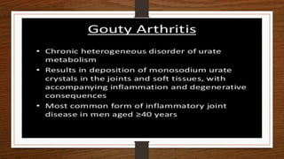 GOUT AND PSEUDOGOUT PRESENTATION BY A 5TH YEAR MEDICAL STUDENT. THIS PRESENTATION IS EDUCATIVE. READ AND KINDLY SHARE WITH FRIENDS, LOEVD ONES, MEDICAL PERSONNELS. THANKS.