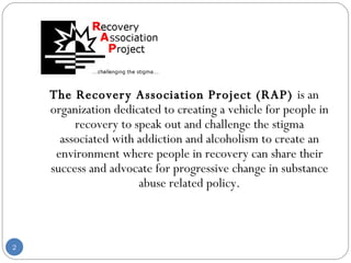 The document discusses the Recovery Association Project (RAP), an organization dedicated to challenging stigma around addiction and advocating for progressive policy change. It outlines RAP's legislative priorities of increasing access to treatment services, preserving health care through the Oregon Health Plan, and expanding alcohol and drug-free housing. As an example, it highlights Gary Cobb's story of overcoming addiction through participating in treatment programs supported by these essential services.