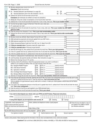 This document is a Montana individual income tax return form for 2008. It includes sections to report income, deductions, exemptions, tax, payments and amounts owed or refunded. The form is for residents filing as single, married filing jointly, or head of household. It provides line items to report wages, interest, dividends, capital gains, retirement income and other income. It allows standard or itemized deductions and exemptions. It calculates tax, nonrefundable credits, payments and any amounts due or to be refunded.