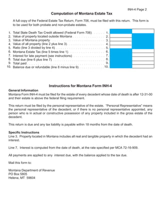 This document is an application for determining estate tax due to the state of Montana upon a decedent's death. It requests information about the decedent, their property and estate, and the personal representative overseeing the estate. The second page provides instructions for completing the form and calculating the ratio of Montana property to total property value in order to determine the portion of the federal estate tax credit allocable to Montana. Any tax due is to be paid within 18 months of the date of death.