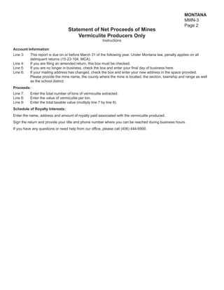 This document is a statement of net proceeds form for vermiculite producers in Montana for the year ending December 31. It requires the producer to provide their name, address, FEIN number, account ID, period covered, tons of vermiculite extracted, value per ton, taxable value by multiplying tons by value, and a schedule of royalty interests including names, addresses, and amounts paid. The completed form is due by March 31 of the following year to the Montana Department of Revenue.