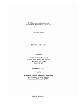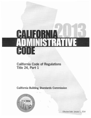 This document summarizes the California Building Standards Administrative Code, which is Title 24, Part 1 of the California Code of Regulations. It provides an overview of the code and outlines the various state agencies that contribute to and enforce provisions within the California Building Standards Code. The summary also lists contact information for each state agency that adopts amendments to the code.