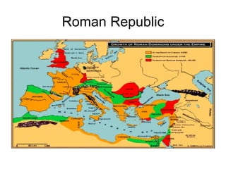 The Roman Republic was initially ruled by two annually elected consuls who shared executive power. The Senate, composed of noble families, acted as lawmakers and advisors. The Assembly, made up of plebeian citizens, could vote on laws but had limited power. This system established principles of representative government and separation of powers. However, the Republic gradually moved towards dictatorship under Sulla and then a triumvirate formed by Caesar, Pompey, and Crassus dominated politics. After the deaths of Sulla and Crassus, the rivalry between Caesar and Pompey led to civil war, from which Caesar emerged as dictator with imperial power, ending the Republic.