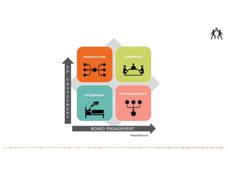 The document outlines essential governance practices for nonprofit boards, emphasizing the roles and responsibilities necessary to ensure effective organizational leadership and resource management. It provides a detailed overview of board duties, strategic planning, fundraising, and member engagement, while underscoring the importance of a shared leadership model between board members and staff. Additionally, it highlights best practices for board recruitment, retention, and the cultivation of donor relationships to support the organization’s mission.