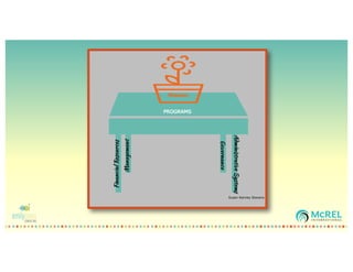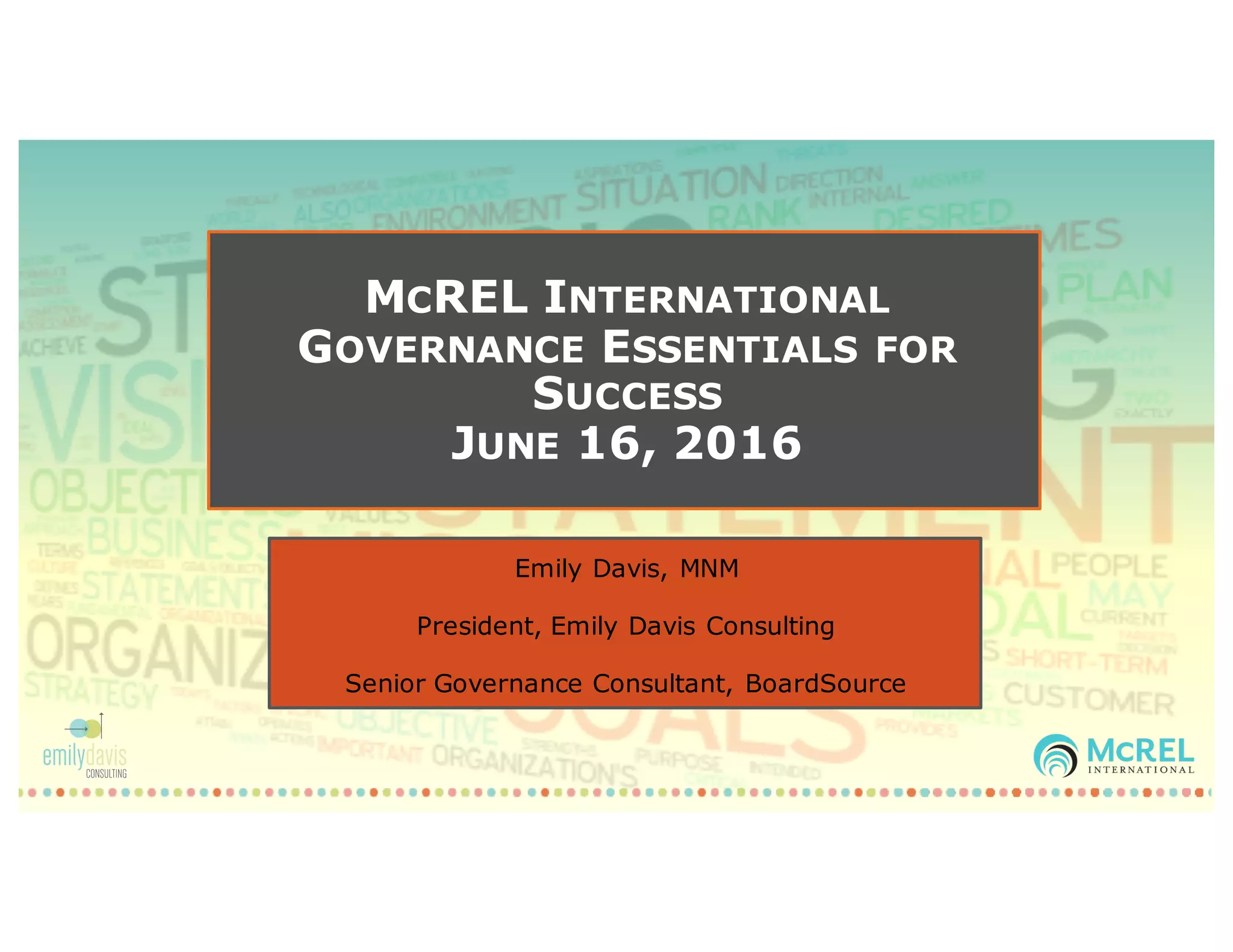 The document outlines essential governance practices for nonprofit boards, led by Emily Davis, emphasizing the importance of shared leadership and the roles and responsibilities of board members. It includes discussions on strategic planning, fundraising, board engagement, and the processes for recruitment and evaluation. Key topics covered include ensuring adequate resources, monitoring programs and services, and fostering legal and ethical integrity within organizations.