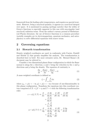 2. The governing equations are transformed to a mass-weighted coordinate system using the Howarth transformation to simplify the treatment of density. Radiation is incorporated as a small perturbation using a dimensionless parameter defined as the product of the radiation absorption coefficient and a characteristic length scale.