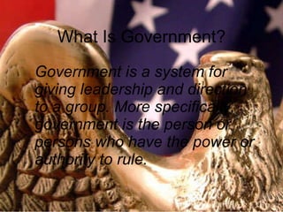 There are five main types of governments according to anthropologists: big man government, chiefdoms, complex chiefdoms, states, and empires. Big man governments were led by the strongest or most intelligent person in small tribes. Chiefdoms emerged around 5000 BC in villages led by hereditary chiefs. Complex chiefdoms had towns and cities led by a super-chief ruling over other chiefs. The first state was Sumer in 3500 BC with multiple levels of government. Empires had several levels of government and controlled multiple states, like the Akkadian Empire.