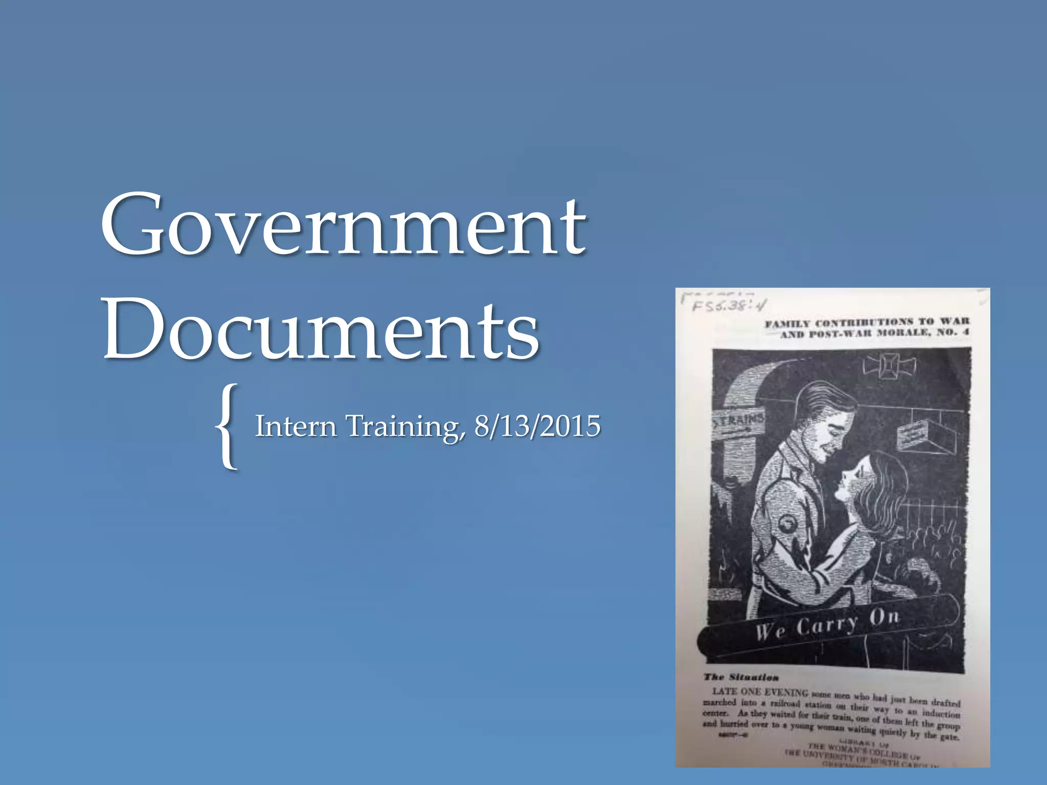The document provides an overview of the Federal Depository Library Program and the government documents collections at Jackson Library, including information on accessing print and digital federal and North Carolina state documents. It describes the classification systems used and examples of catalog records, as well as tips for searching for additional government information resources.