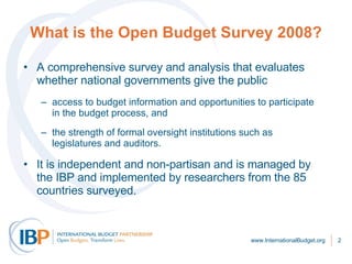 The Open Budget Survey 2008 evaluates budget transparency in 85 countries and finds that most governments provide minimal or no public access to budget information. Only five countries received an "extensive" rating, while 41 received "minimal, scant, or no information." Oversight institutions like legislatures and auditors are also often weak. However, many countries already produce budget documents internally and transparency could be improved at low cost by publishing these. The survey recommends governments publish more information and engage the public more, while donors should make aid more transparent.