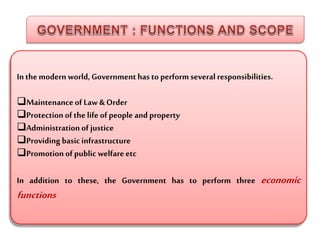The document discusses the three main economic functions of government: allocation, distribution, and stabilization. The allocation function refers to the government making public goods like roads, parks, and national defense available to all citizens. The distribution function aims to reduce inequality in income and wealth through government activities. The stabilization function involves the government working to maintain stable economic growth and low unemployment.