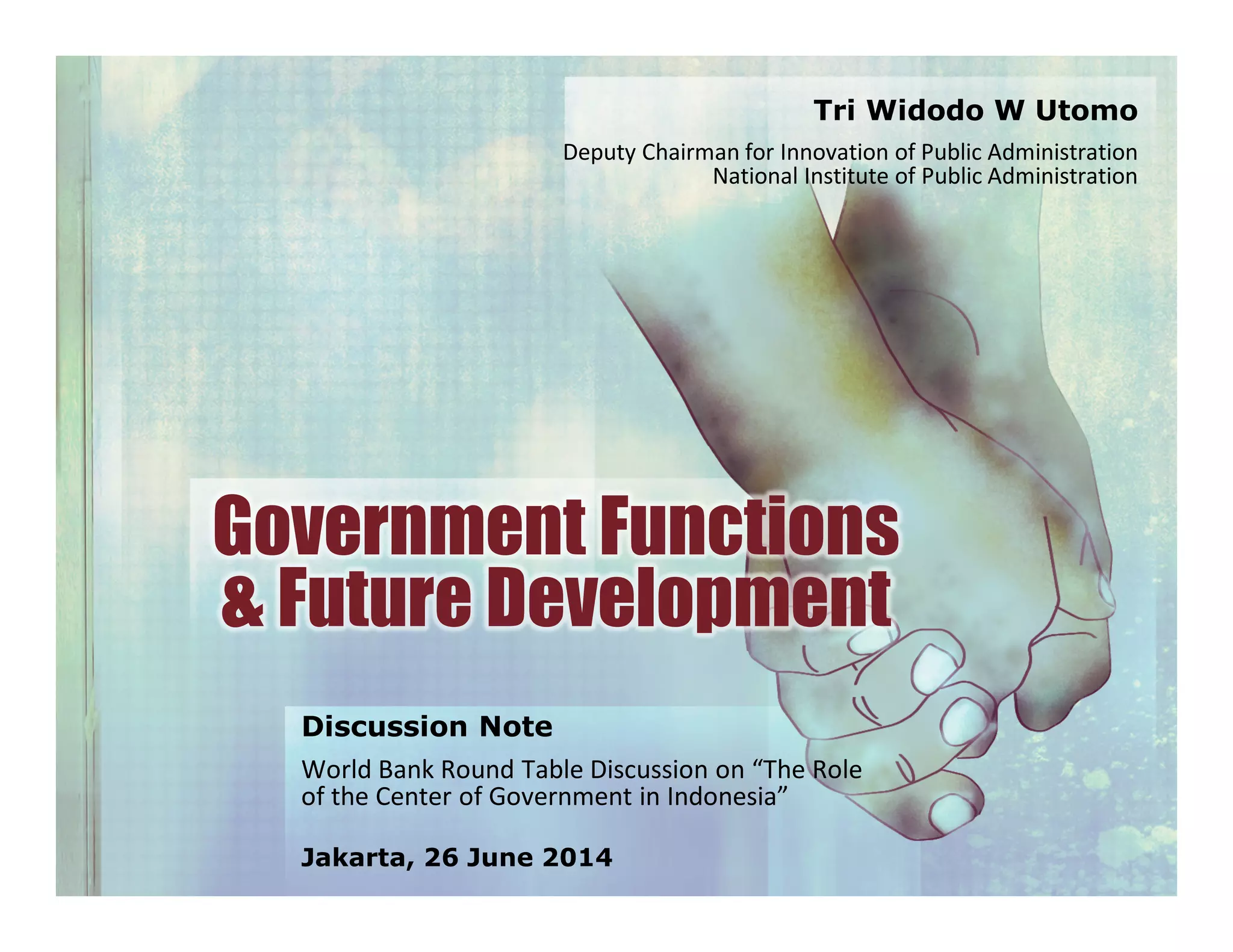 The document discusses the role of the center of government in Indonesia, emphasizing the need for a shift from a regulatory state to one that facilitates and empowers citizens. Key issues identified include weaknesses in government coordination, conflicting policies, and challenges in human resources and infrastructure. Recommendations for improvement focus on re-arranging government functions, enhancing policy-making processes, and integrating planning and budgeting systems.