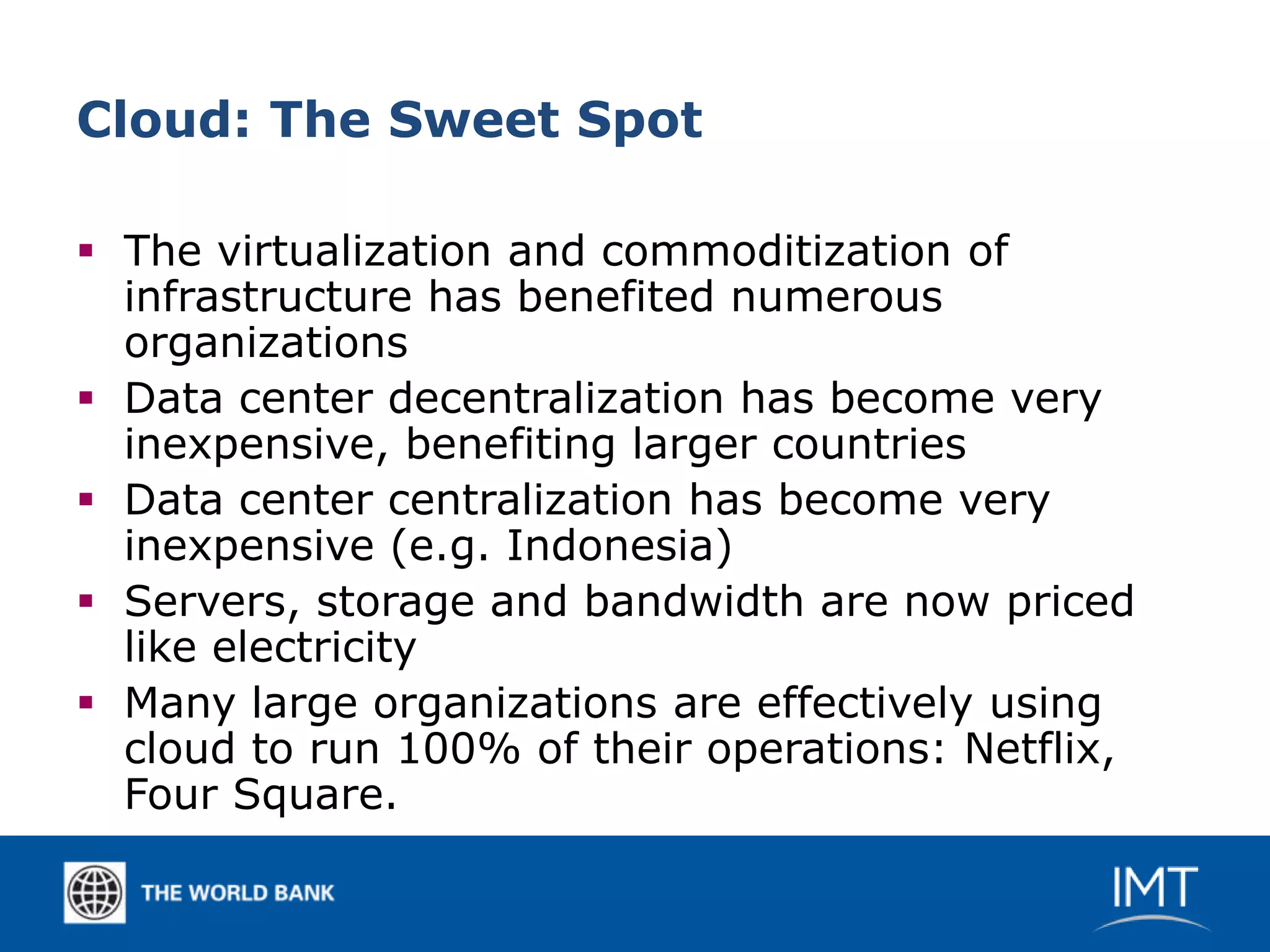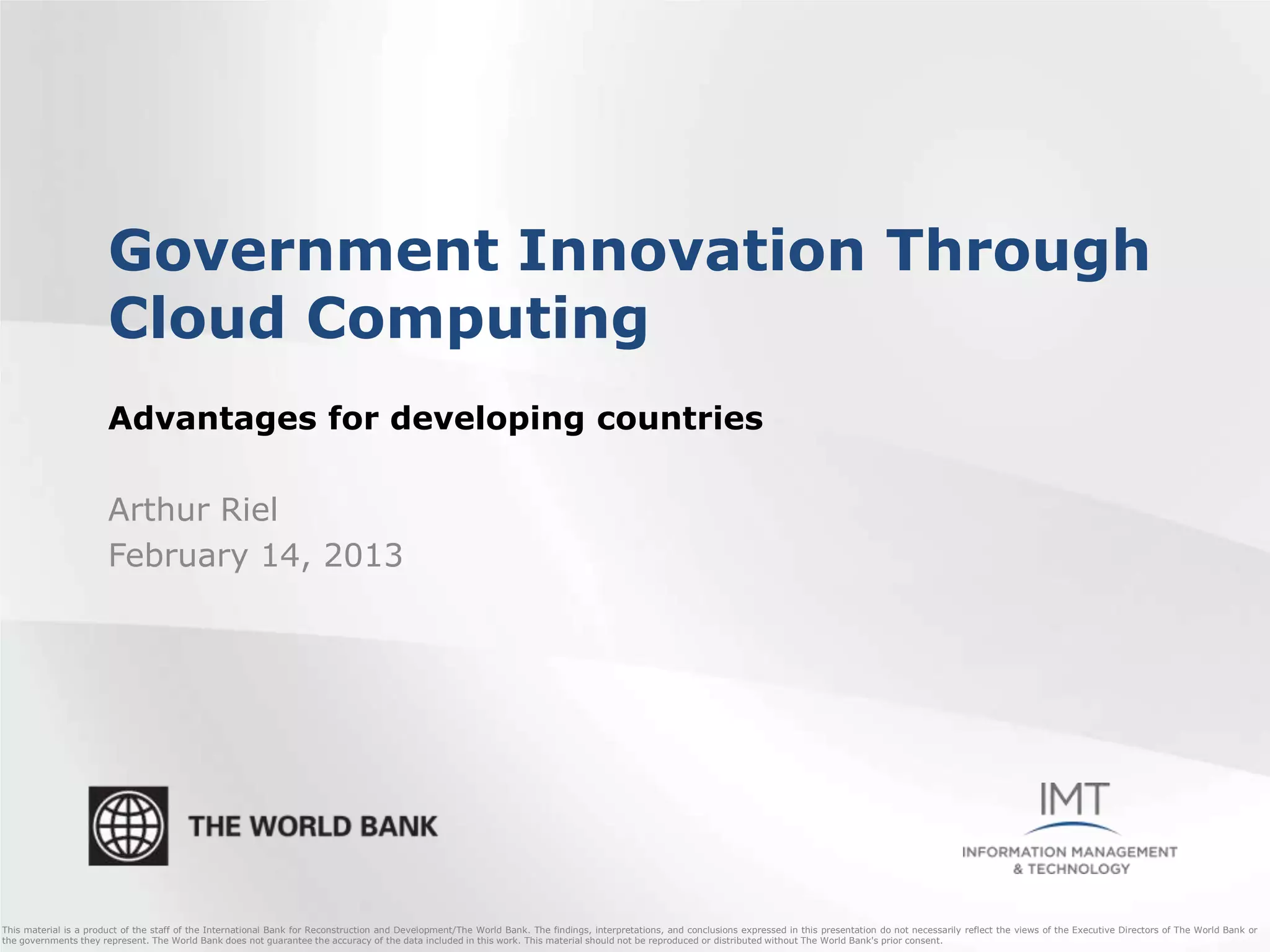 Government innovation through cloud computing provides several advantages for developing countries according to the document. Key benefits include lower upfront costs than maintaining own data centers, easy scalability with increased usage, and eliminating hardware refreshes and infrastructure planning. The document discusses how cloud computing can enable efficient eGovernment services, mobility initiatives, document management, and email/collaboration for governments. However, it notes some legal issues around data sovereignty and jurisdiction need to be considered when using public clouds.