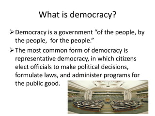 This document provides an overview of the Australian government system. It describes that Australia has a representative democracy and constitutional monarchy. The government has three levels - federal, state, and local - each with their own roles and responsibilities. Laws are made through a bill process that involves both the House of Representatives and Senate. Citizens vote in elections using a preferential voting system to support democracy.