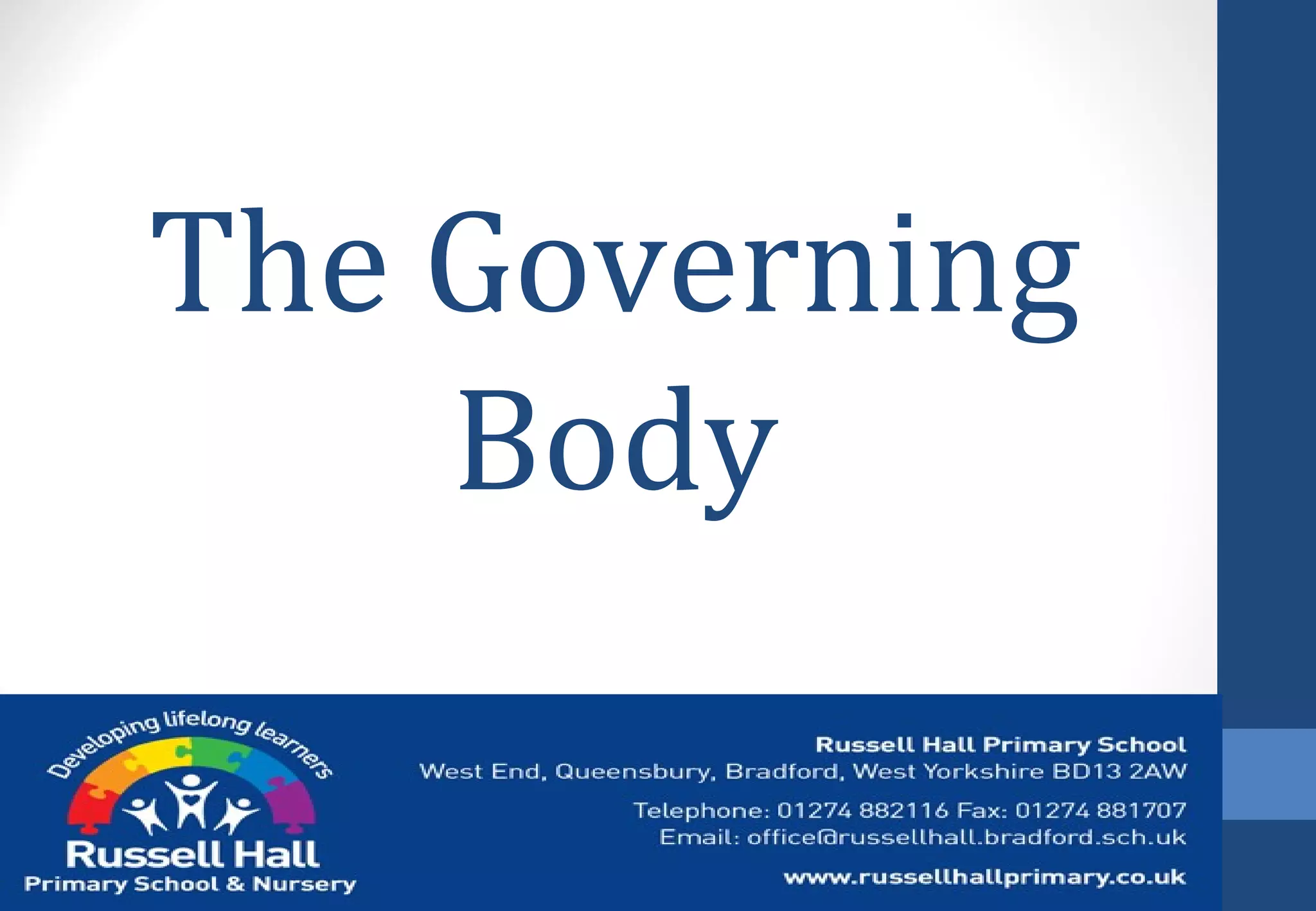 The document outlines the roles and responsibilities of a school governing body, including developing the school vision, holding the head teacher accountable, overseeing finances, and setting policies. It describes the types of governors such as parent, staff, partnership, and local authority governors. The final sections provide details on the current governing body structure and contacts for support available to governors.