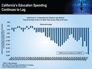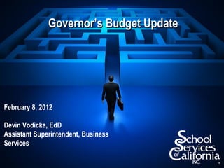 The Governor's budget update proposes another "crisis" budget that relies on temporary tax increases to avoid deep cuts to education. If the tax measure fails, K-14 education would be cut by $4.8 billion, reducing per-student funding by about $370. The budget also introduces a weighted student funding formula to replace most categorical programs and revenue limits over five years, but districts could gain or lose funding depending on their student demographics. Locally-funded districts may see impacts from changes to redevelopment agency funding and the new finance model. Districts must develop budgets with uncertain funding levels and await the final state budget.