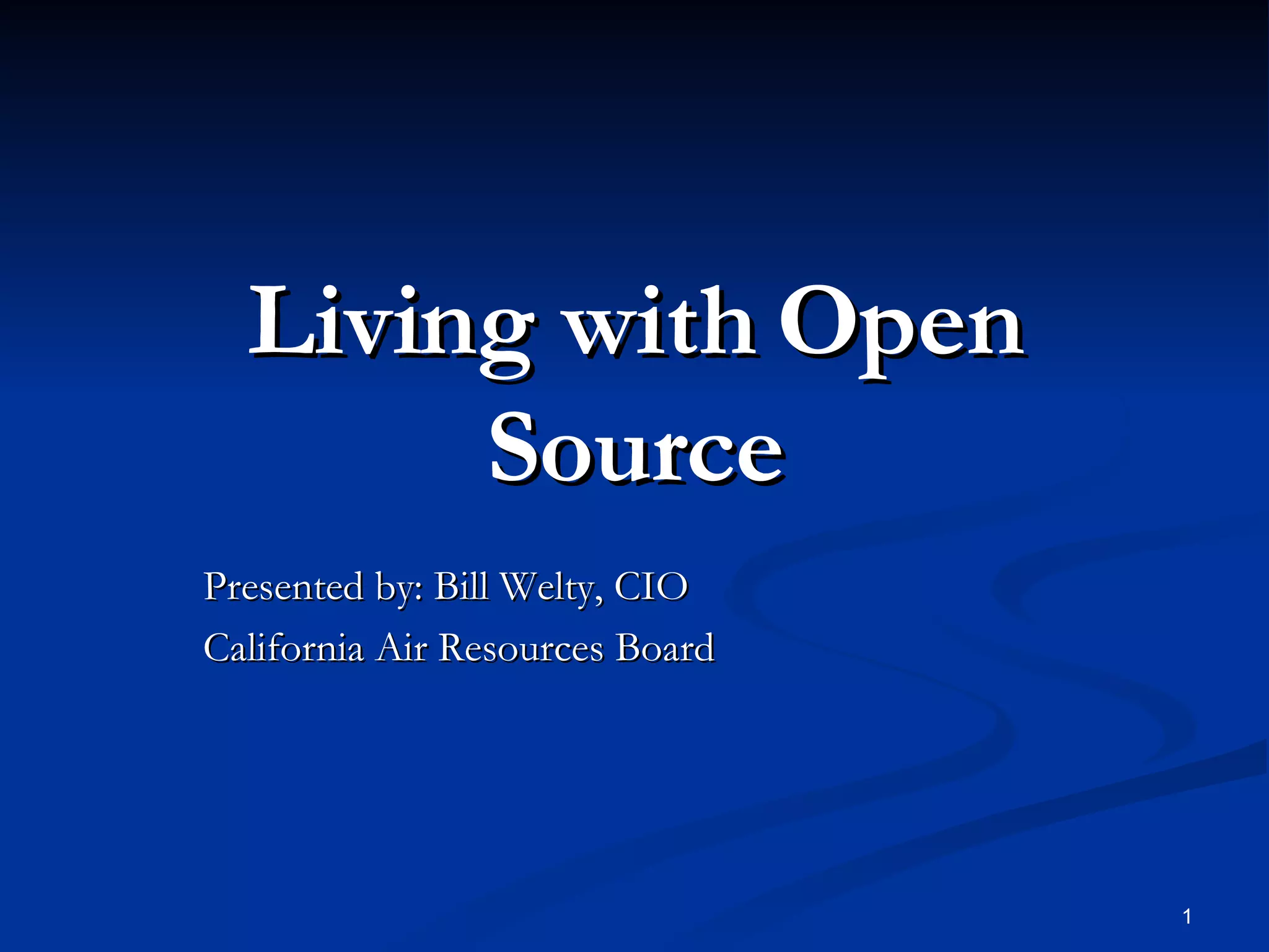 The document discusses the California Air Resources Board's (CARB) use of open source software. It describes how CARB has found open source to be reliable, secure, and cost-effective. It provides examples of how CARB has implemented open source solutions like Linux, Apache, and PHP that have resulted in significant cost savings compared to proprietary alternatives. It also notes trends in growing adoption of open source software by organizations and businesses.
